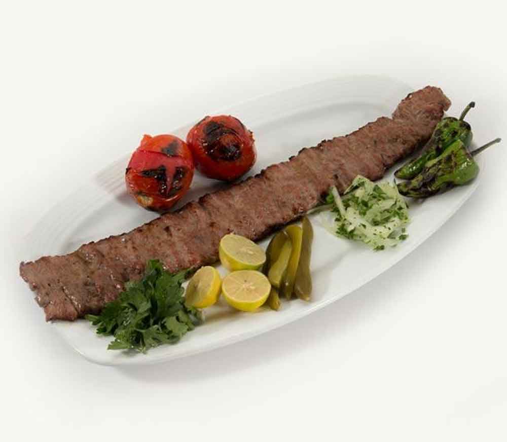 دو سیخ کوبیده120 گرم به همراه دورچین و سیب زمینی سرخ شده