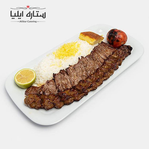 جوجه کباب زعفرانی سینه مرغ 250 گرمی یک لایه کباب کوبیده 125 گرمی یک پرس برنج ایرانی 350 گرمی دورچین فلفل کبابی،ترشی و خیارشور اسلایس شده،لیموترش تازه،سیب زمینی سرخ شده