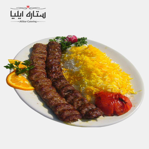 یک سیخ کباب کوبیده گوسفندی 120 گرمی به همراه برنج ایرانی (آماده سازی تمامی غذاهای شرکتی 4 ساعت به طول می انجامد)