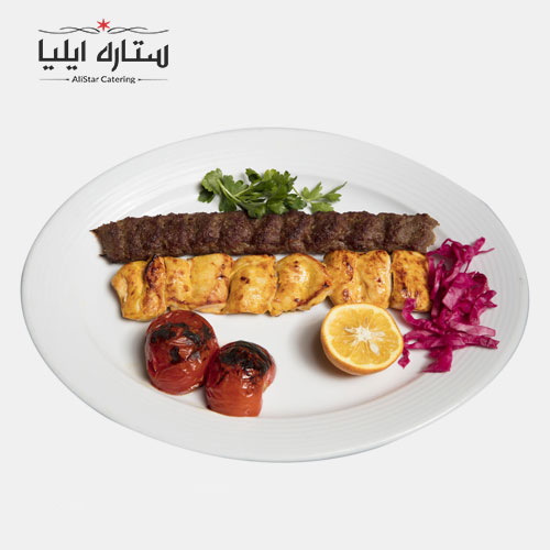 یک سیخ جوجه کباب سینه مرغ زعفرانی 250 گرمی یک سیخ کوبیده گوسفندی 250 گرمی به همراه دور چین عالی به همراه 300 گرم برنج ایرانی